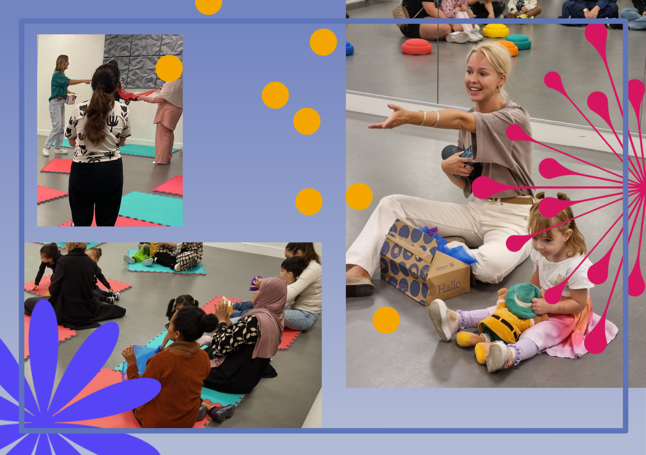 Het begon met een vrolijke danssessie met organza doeken, waarna het licht uitging en de muziek rustgevend werd. Terwijl de kindjes daarna met Lotte (pedagogische coach bij Jongleren en betrokken bij het VrouwenBuurtLab voor de kinderoppas) naar het naastgelegen lokaal gingen om te spelen, gingen de moeders in gesprek over hoe belangrijk beweging is voor kinderen. Daar spraken zij ook over het nadoen: kinderen leren door hun ouders na te bootsen. Wist je dat een kind gemiddeld iets 100 keer moet herhalen voordat het echt weet hoe het moet?